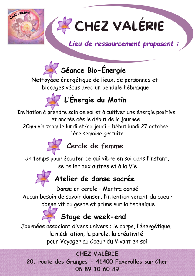 Valérie aime organiser des événements qui emmènent chacun à être à l’écoute du vivant qui circule en soi au travers de :